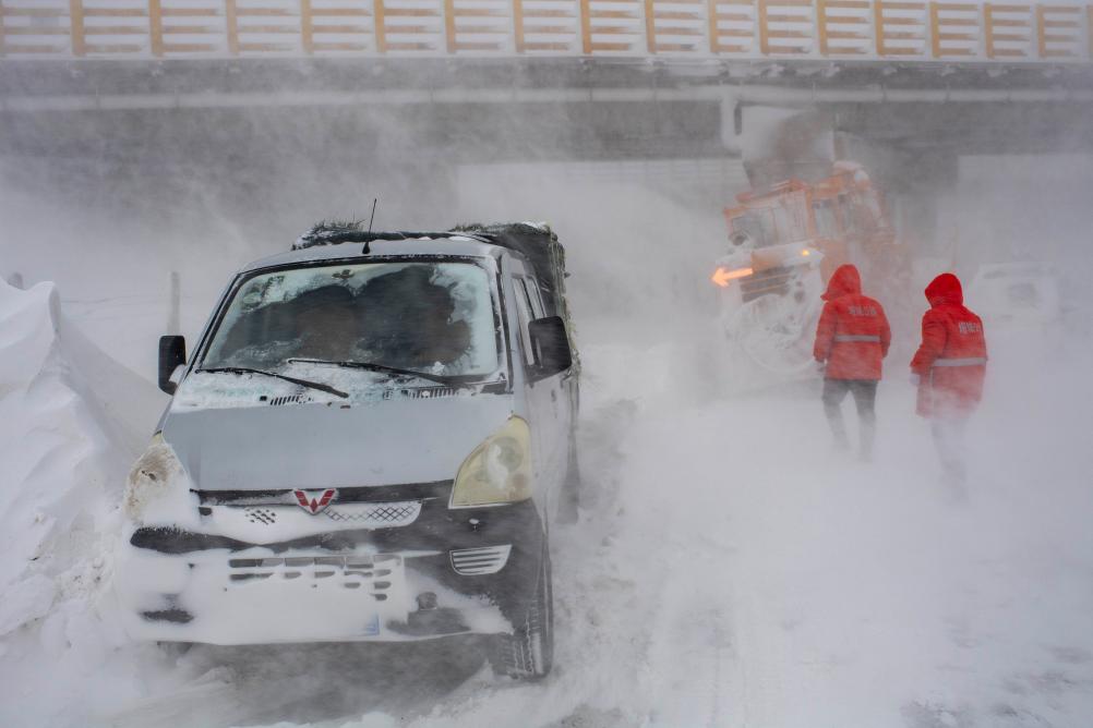 瑪依塔斯防風(fēng)雪搶險基地的工作人員頂風(fēng)冒雪搜尋被困旅客(2021年1月23日攝)。
