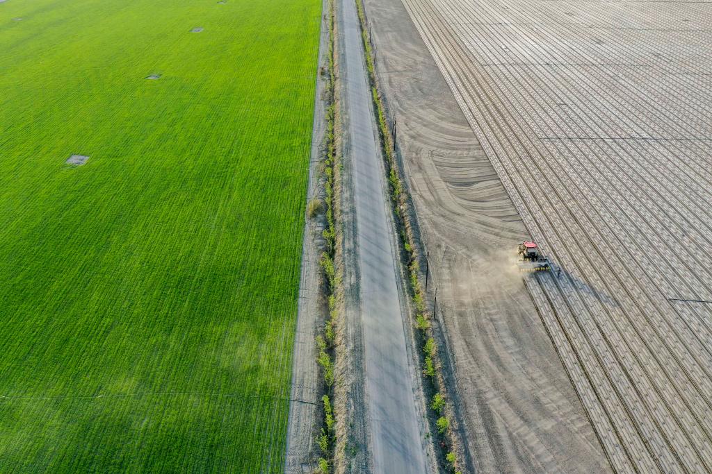 棉農(nóng)在新疆沙灣市大泉鄉(xiāng)五道河子村的棉田春播,一旁的小麥長勢良好(2022年4月17日攝)。