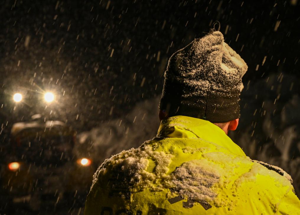 新疆喀納斯景區(qū)公安局交警大隊民警馬國軍在一處山路雪崩救援現(xiàn)場工作(2023年1月8日攝)。