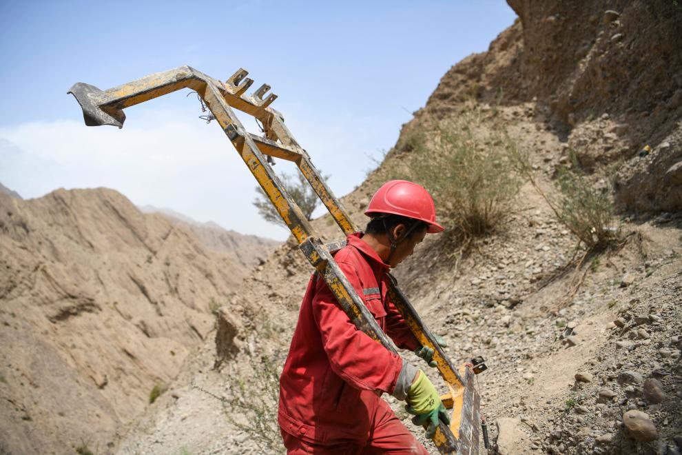 電力工人在新疆塔什庫爾干塔吉克自治縣的深山中安裝用于放線的零件(2019年11月23日攝)。
