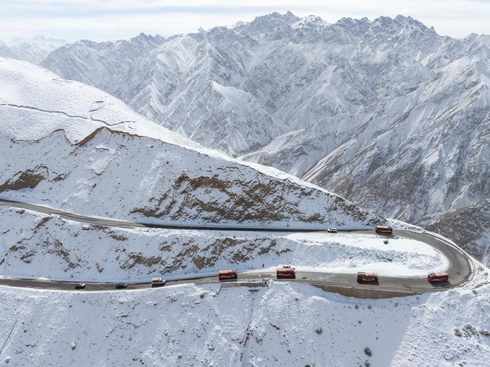 由警車開道、救護車隨行的上學(xué)車隊穿行在昆侖山區(qū),帶著西合休鄉(xiāng)的初中生前往縣城上學(xué)(2024年2月26日攝)。