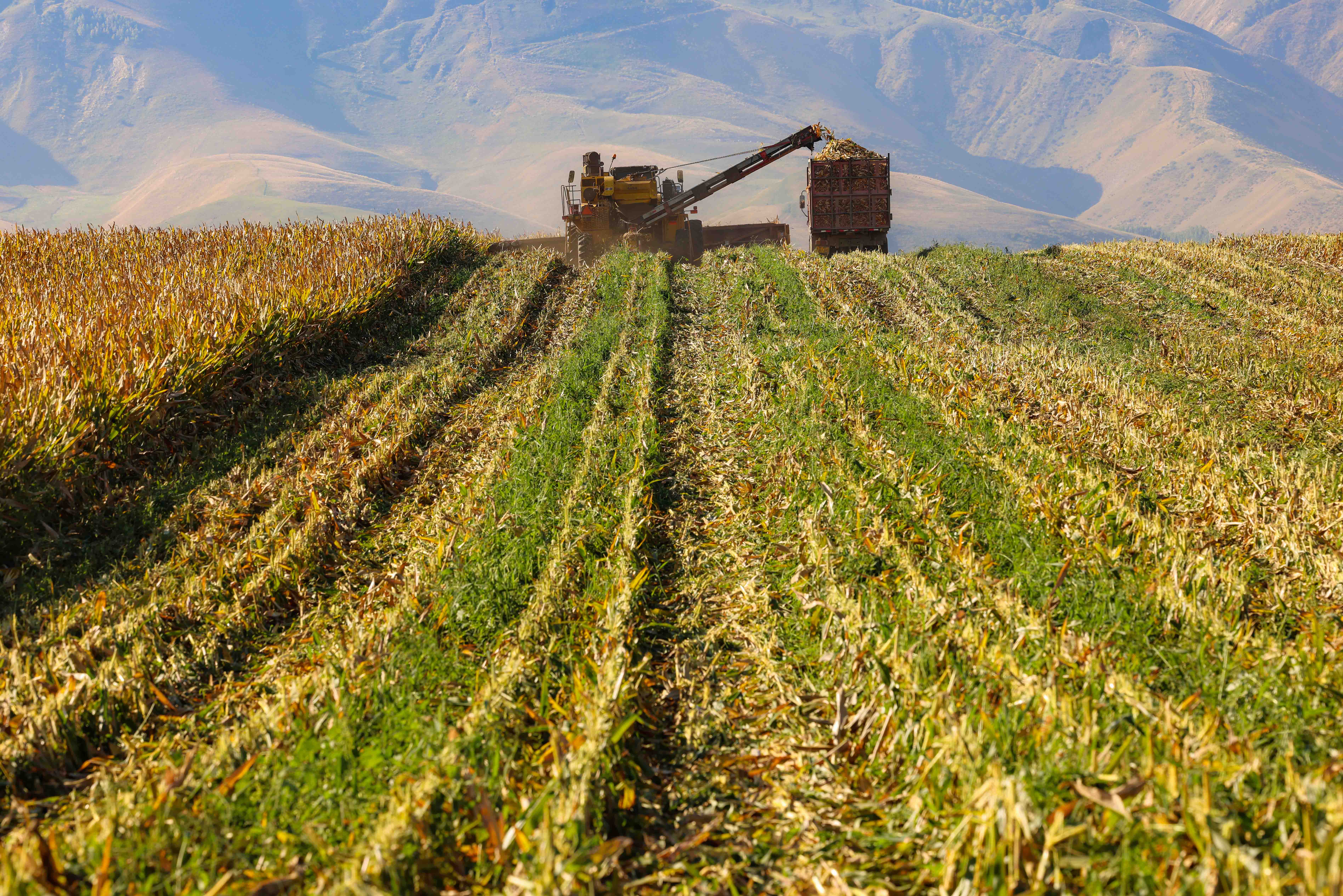 在新疆伊犁哈薩克自治州一處農(nóng)田里,收割機(jī)在采收玉米。(受訪單位供圖)