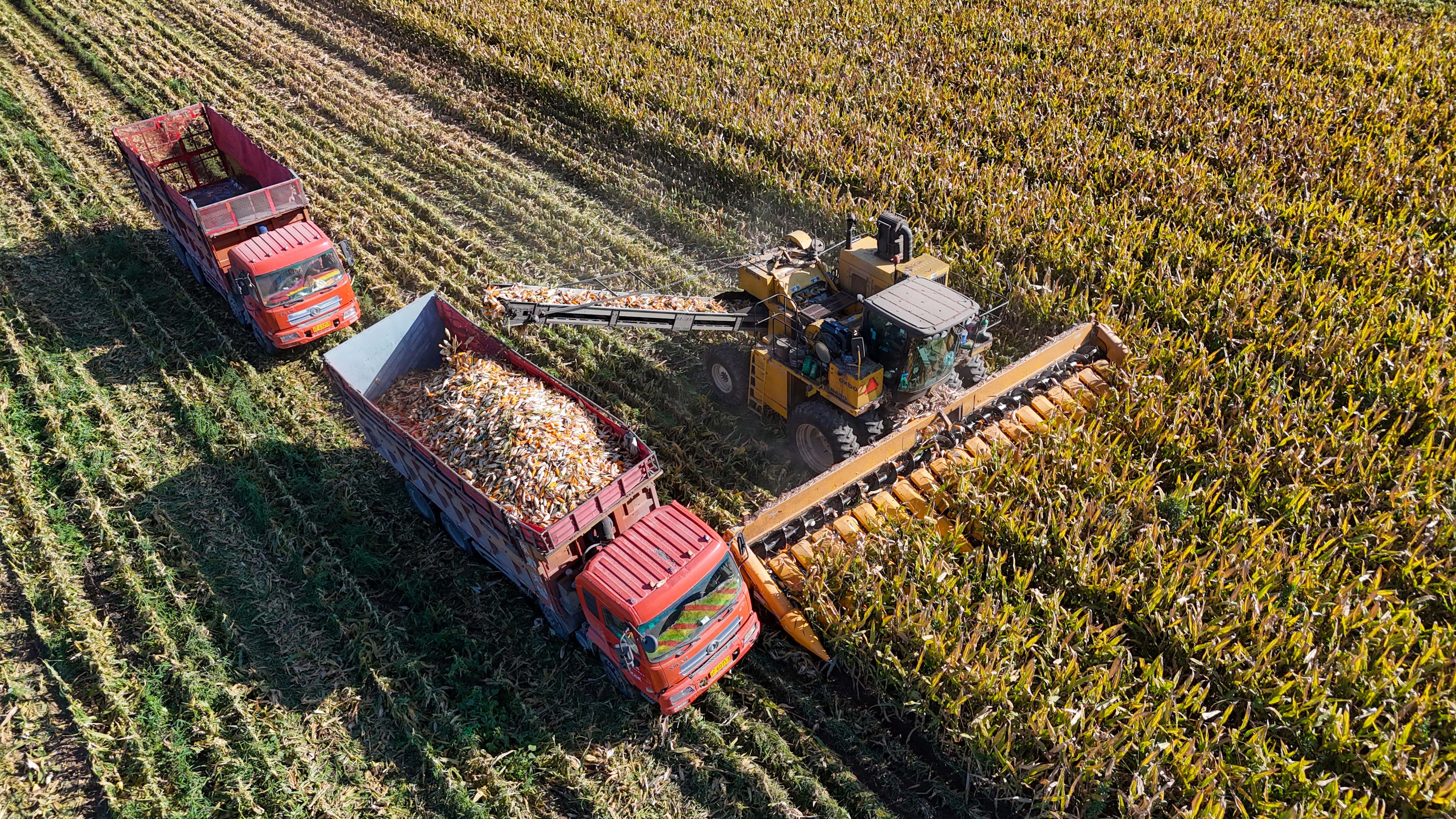 秋收時(shí)節(jié),收割機(jī)轟隆隆駛過田野,拉運(yùn)車車廂里很快堆滿金黃的玉米粒。天山南北廣袤糧田里,處處展現(xiàn)豐收圖景。