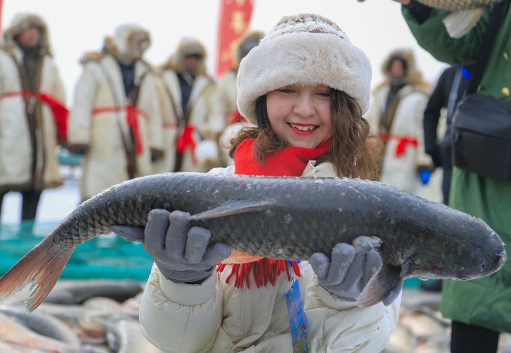 1月18日,在博斯騰湖冰面上,游客手捧剛打撈上來的博斯騰湖魚。新華社發(fā)(年磊攝)