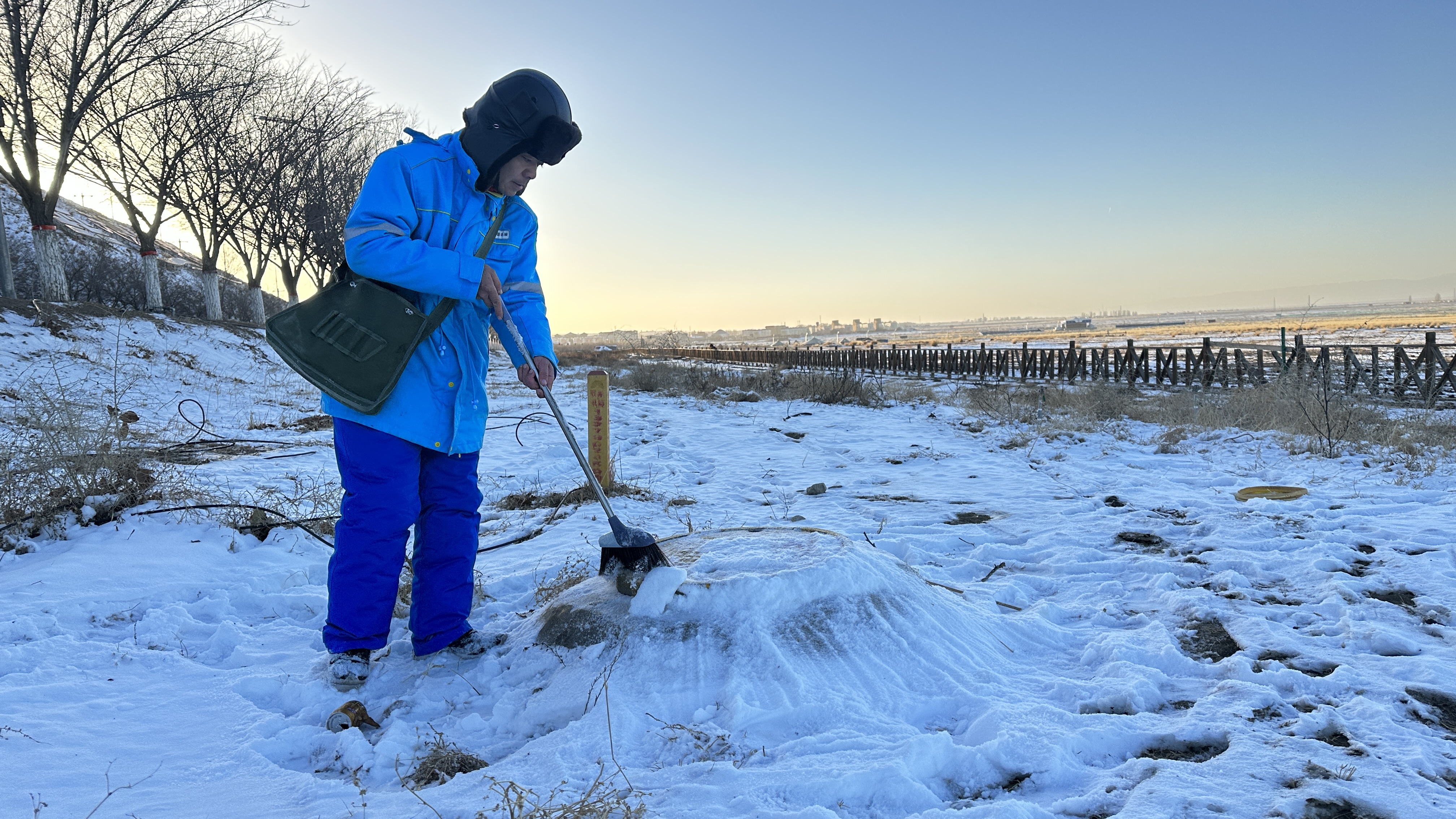 11月15日,一場大雪過后,哈密巴里坤公司巡線工趙先濤正在清理天然氣閥井周邊的積雪。